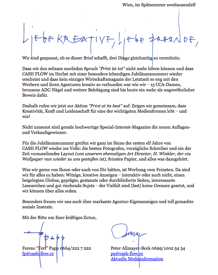 Dass wir den seltsam morbiden Spruch „Print ist tot“ nicht mehr hören können und dass CASH FLOW im Herbst mit einer besonders lebendigen Jubiläumsnummer wieder erscheint und dass kein einziges Wirtschaftsmagazin der Letztzeit so eng mit den Werbern und ihren Agenturen kreativ so verbunden war wie wir − 15 CCA-Damen, bronzene ADC-Nägel und weitere Belobigung sind bis heute ein mehr als ungewöhnlicher Beweis dafür.