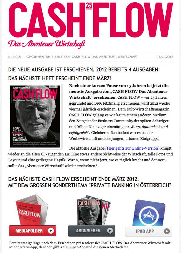 Nach einer kurzen Pause von 15 Jahren ist jetzt die neueste Ausgabe von „CASH FLOW Das Abenteuer Wirtschaft“ erschienen. CASH FLOW – vor 25 Jahren gegründet und 1996 letztmalig erschienen, wird 2012 wieder viermal jährlich erscheinen. Dem Kult-Wirtschaftsmagazin CASH FLOW gelang es wie kaum einem anderen Medium, den Zeitgeist der Business Community der späten Achtziger und frühen Neunziger einzufangen: „Jung, dynamisch und erfolgreich”. Gleichermaßen beliebt war es bei der Werbewirtschaft und der jungen, urbanen Zielgruppe.
