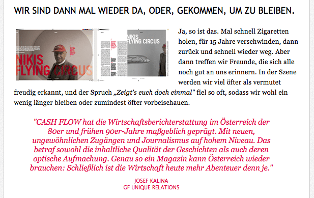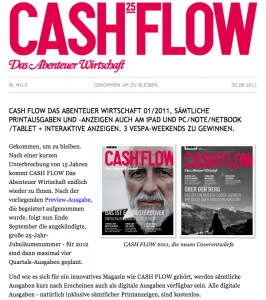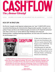 Die Preview-Ausgabe wurde begeistert aufgenommen, das „neue“ CASH FLOW wird als wesentliche Bereicherung des österreichischen Magazinmarktes gesehen. Jetzt geht es mit großem Tempo und Elan an die Jubiläumsausgabe, die bereits am 30. September präsentiert wird. Dann, ab 2012 bis zu viermal jährlich. Rege Nachfrage auch seitens der Werbewirtschaft. Vielfältige Buchungsmöglichkeiten, die auch schon 2012 betreffen, bieten für jede Kampagne etwas.